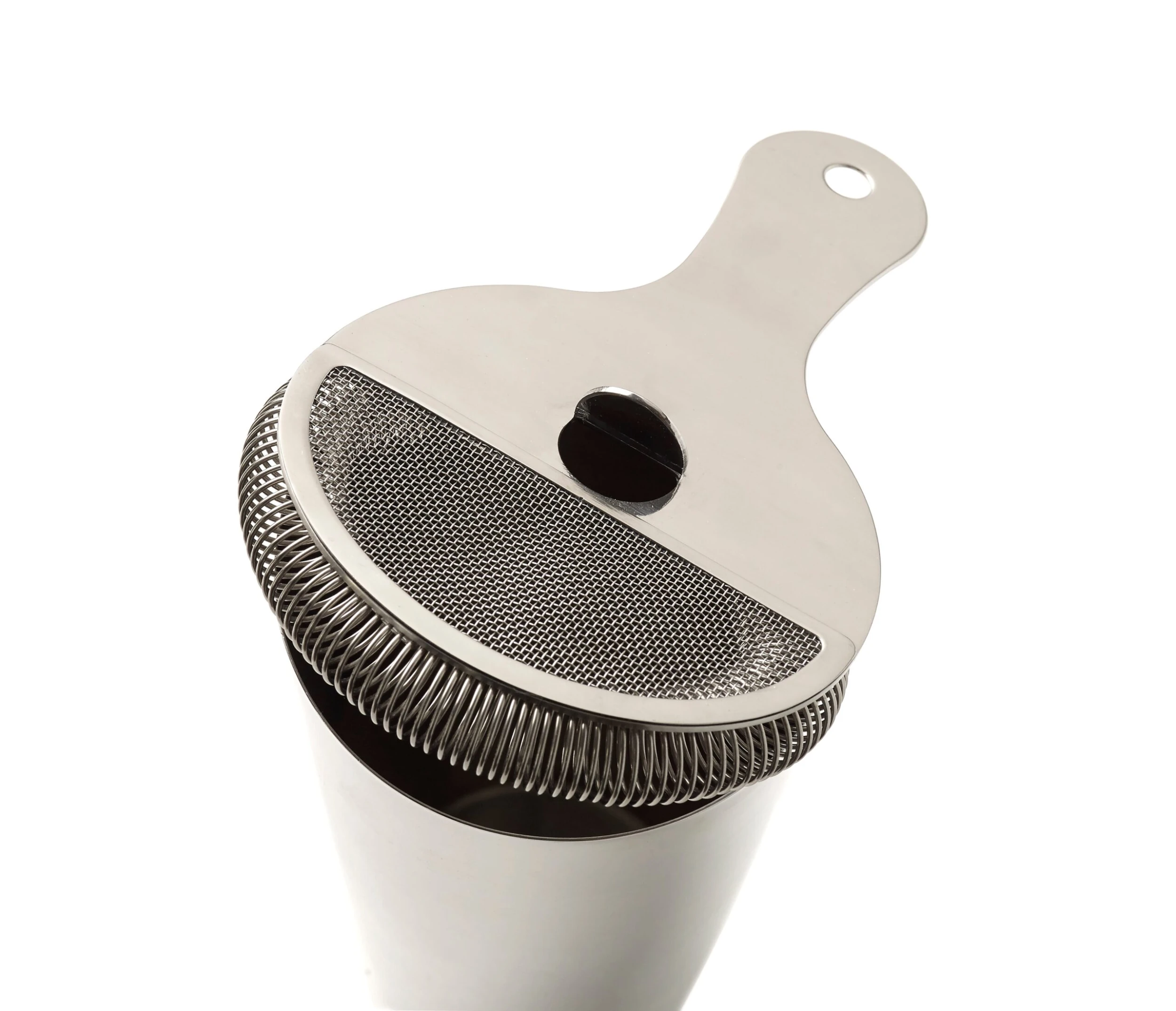 This strainer can both fine and normally strain a cocktail. When put into the shaker it sits and works like a regular hawthorn but can then be slid forward for the fine mesh to cover up the lip of the shakers and your fine straining, removing all the smaller bits. A new design and essential tool.