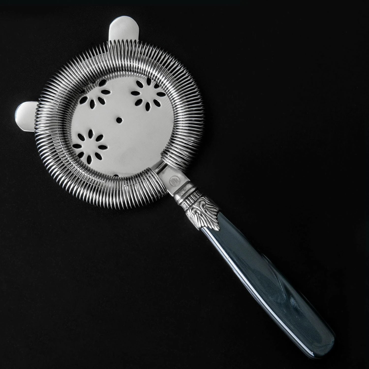The premium 18/8 stainless steel strainer head is complemented by a decorative black pearlised handle. A stunning Neoclassical inspired stainless steel clasp attaches the head to the handle.