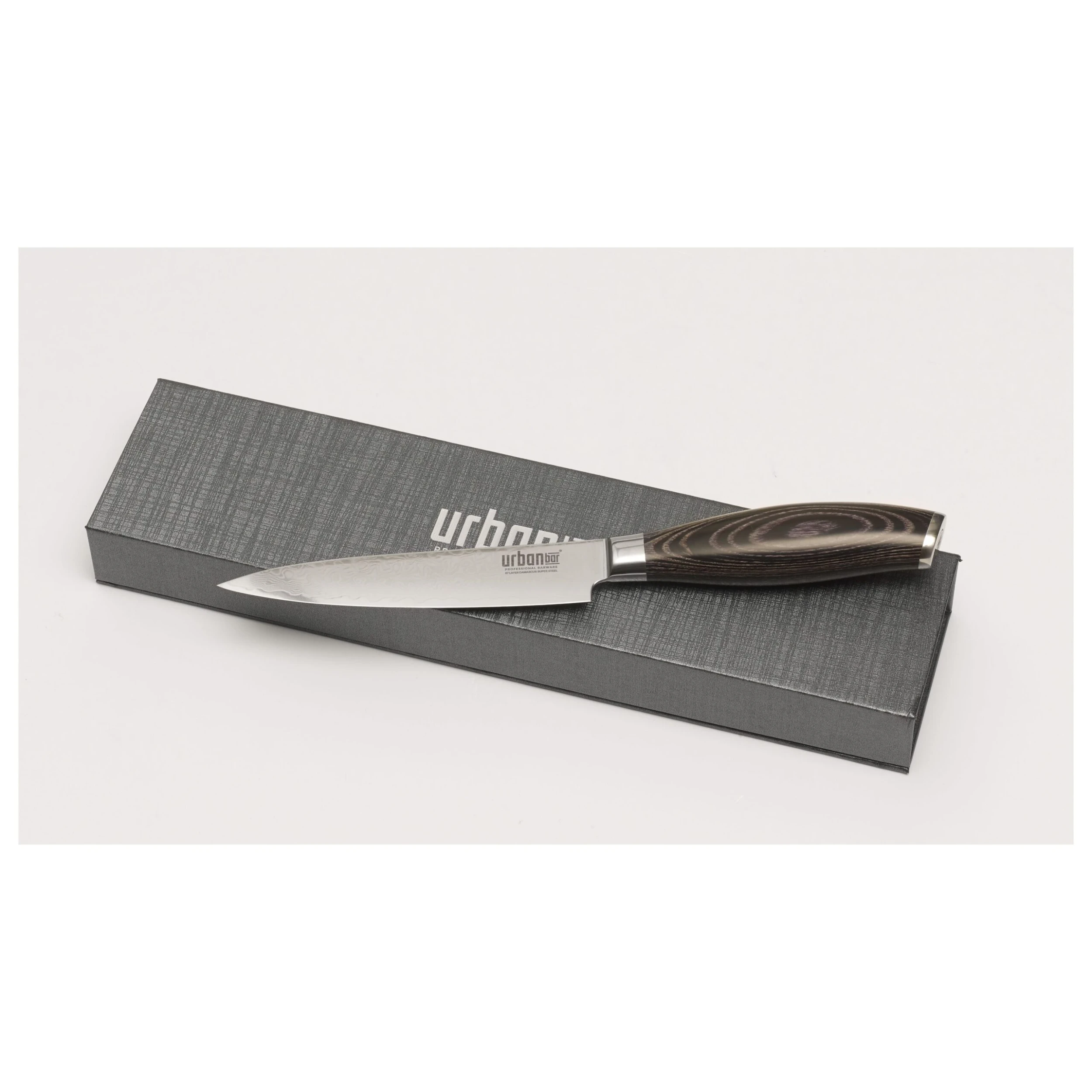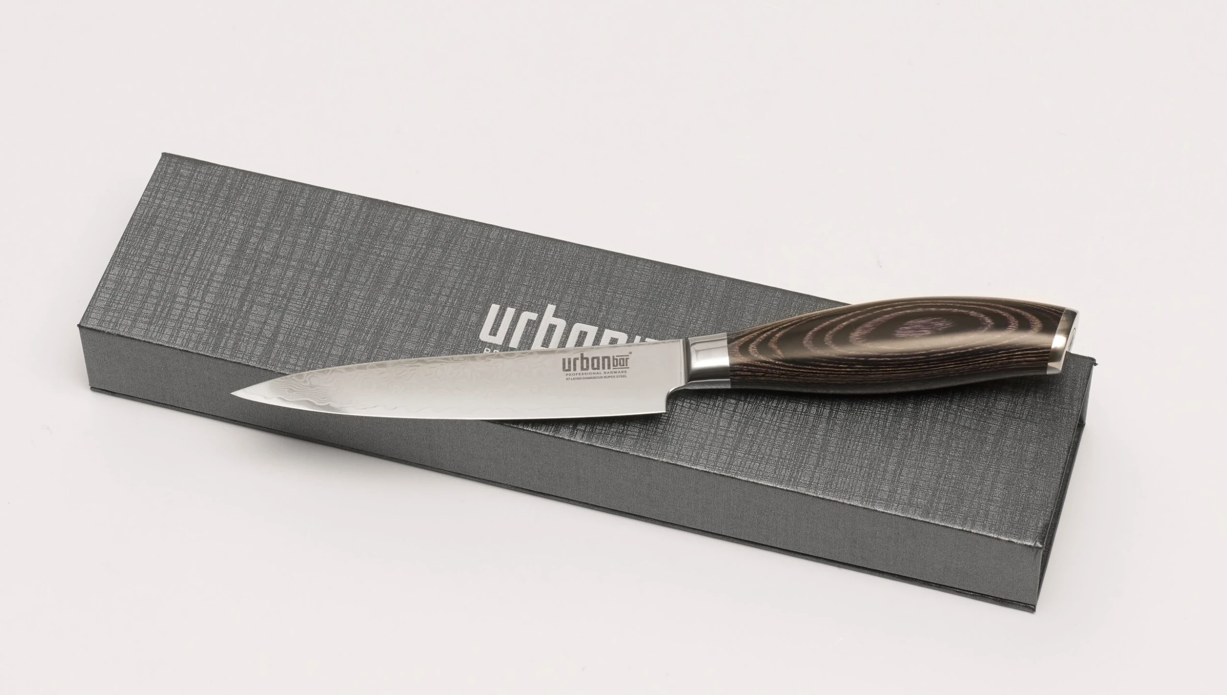 Achieve the precision of centuries of Japanese craftsmanship with the professional Damascus Steel Bar Knife. This impressive 67-layer steel knife uses VG-10 cobalt alloy steel to give great longevity and excellent sharpness. This professional knife makes the Damascus pattern with 67 layers of steel that have been ice hardened and tempered again at a high heat to create a blade designed for excellent cutting. Housed in a sleek black box, this knife is ideal for gifting to any serious bartender.