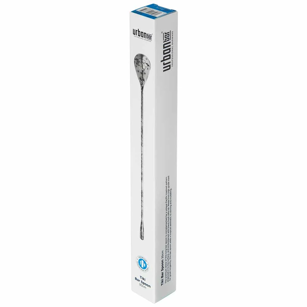 Classic teardrop tip bar spoon with stunning etched tropical icons coloured with food-safe ink. The Tiki Bar Spoon adds a Hawaiian vibe to your mixology.